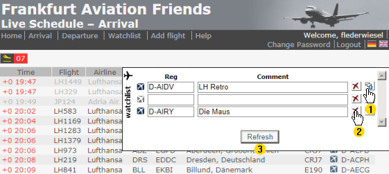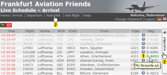 • (1) Let your favourite aircrafts be hilighted in green. A list thereof - including a comment per aircraft - will be stored within your user profile.