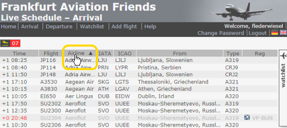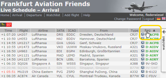 • If you are logged in and have defined a watchlist, the watched aircrafts will be sorted first.